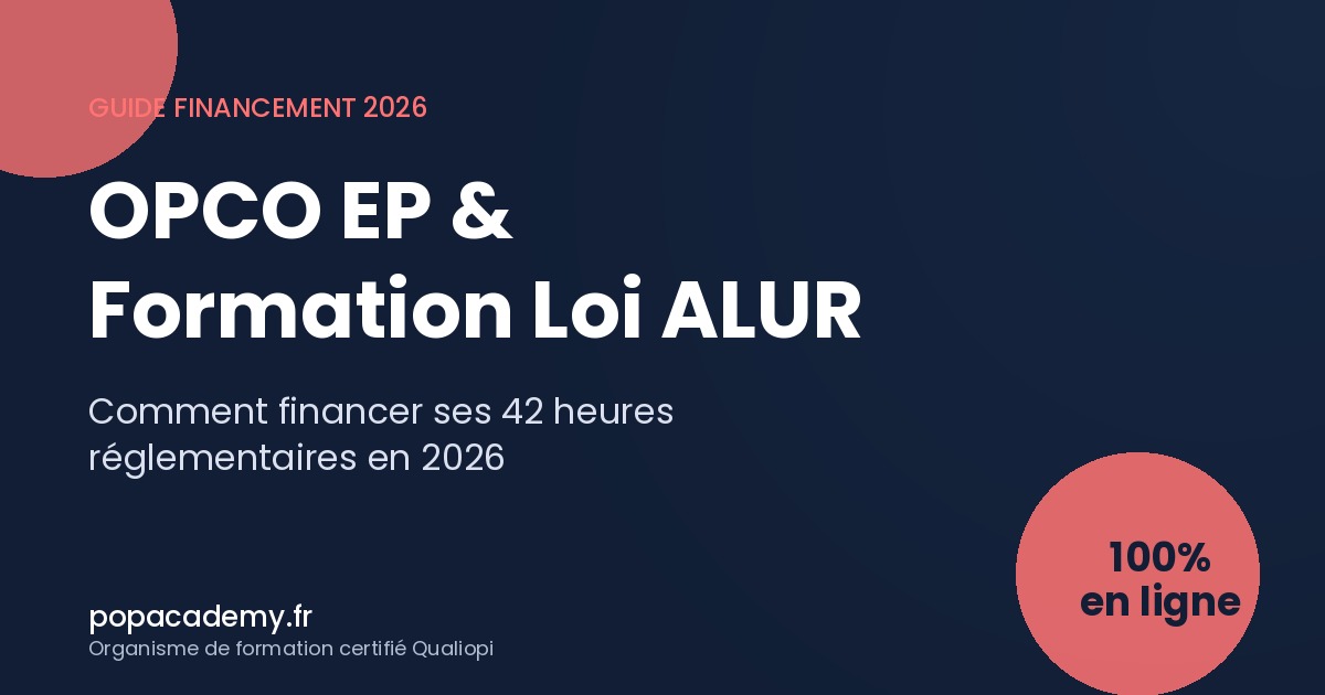 Pop Academy est certifié Qualiopi depuis 2023, ce qui garantit l'éligibilité de toutes nos formations Loi ALUR au financement OPCO EP, AGEFICE et FIF-PL.